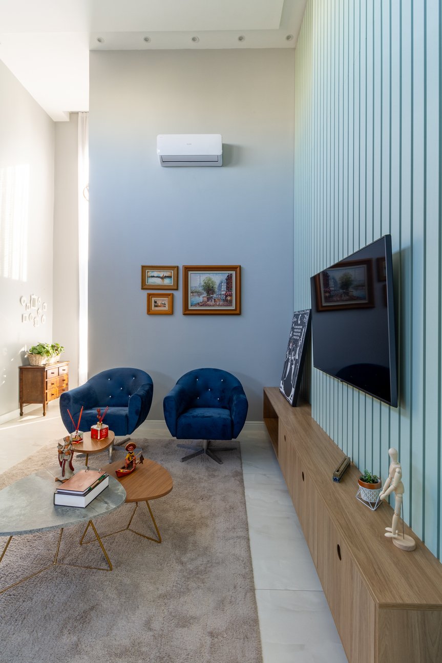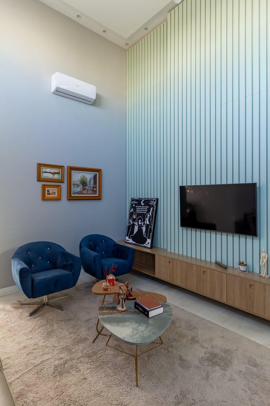 Nossa abordagem criativa trouxe uma dimensão mais ampla deste lar. Uma das características mais notáveis é a incorporação do lambri no painel da TV, um elemento clássico que adiciona uma sensação de elegância e charme atemporal à sala de estar.