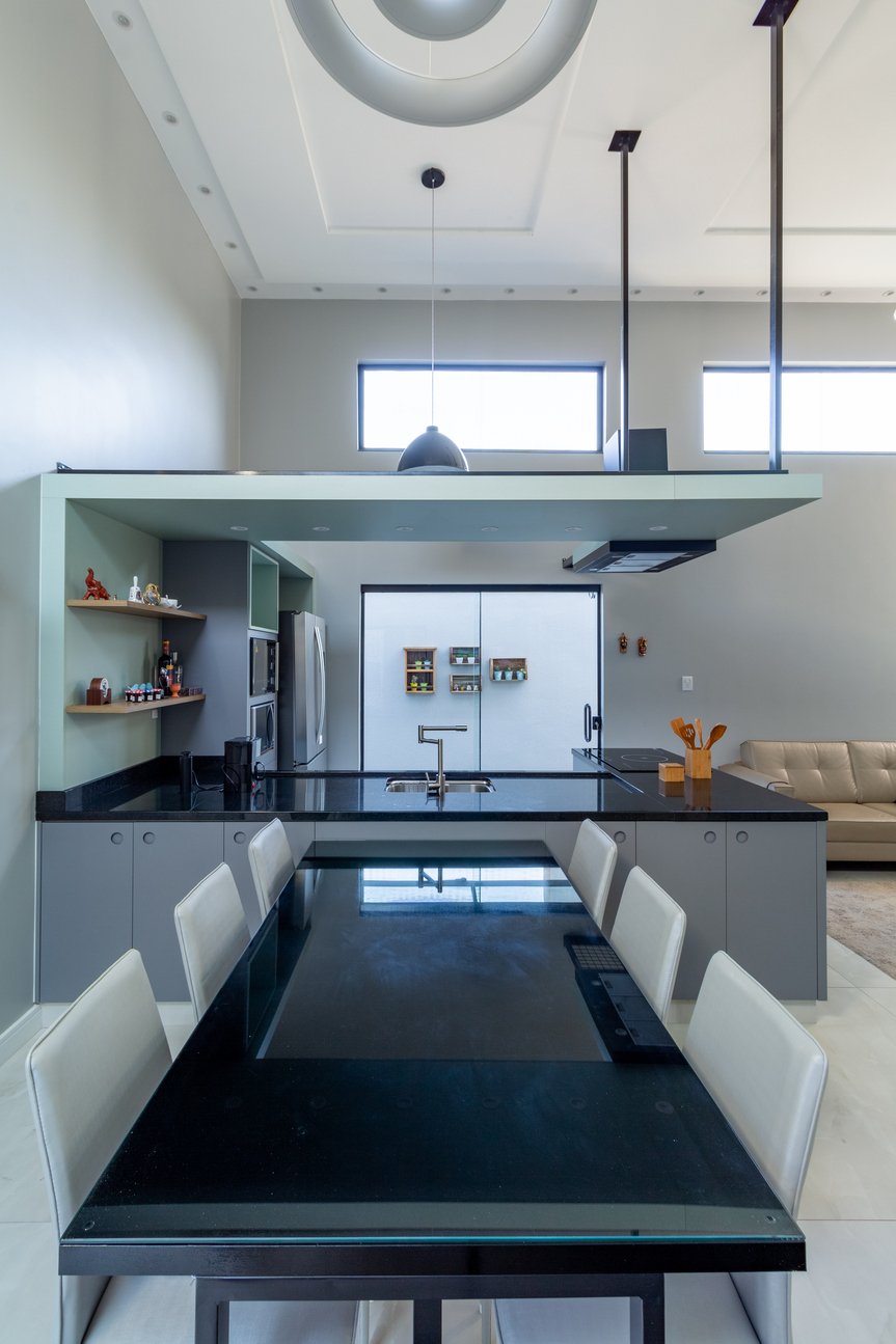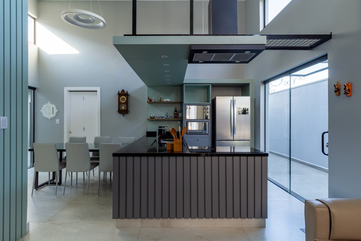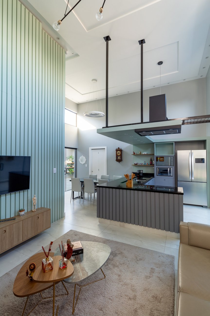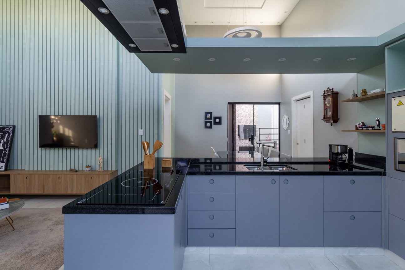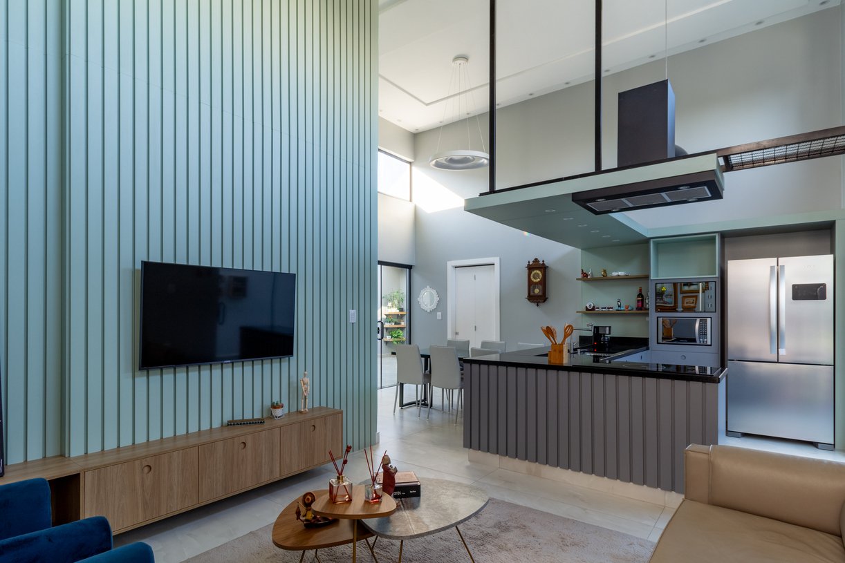 O contraste entre os tons suaves utilizados na sala de TV e a paleta de cor escura na cozinha cria uma dinâmica intrigante e visualmente cativante. Essa contraposição de estilos não apenas adiciona profundidade ao espaço, mas também revela a versatilidade do design de interiores.